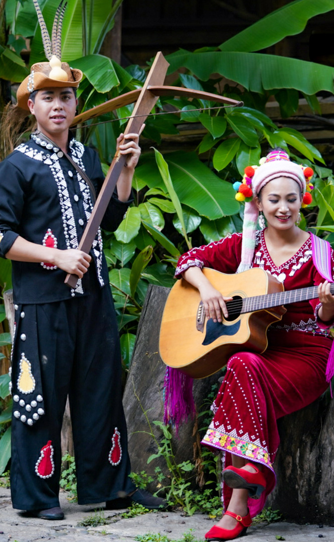 基諾族人口約1.8萬,主要聚居在云南省景洪縣的基諾山區?;Z族寨與佤族寨、布朗族寨一橋相連,隔水相望。步入基諾族寨,可以看到綠樹鮮花叢中點綴著嶙峋怪石,一幢幢基諾族茅草屋錯落有致,仿佛走進了山巒起伏的基諾山區?;Z族寨建有基諾族群眾的大公房、民居樓、糧倉和太陽廣場。基諾族能歌善舞,有著豐富的文化。在表現基諾族太陽崇拜的太陽廣場上,歡快熱烈的“太陽鼓舞”,鼓聲雄健深厚,舞姿輕快活潑,是基諾族最具民族...